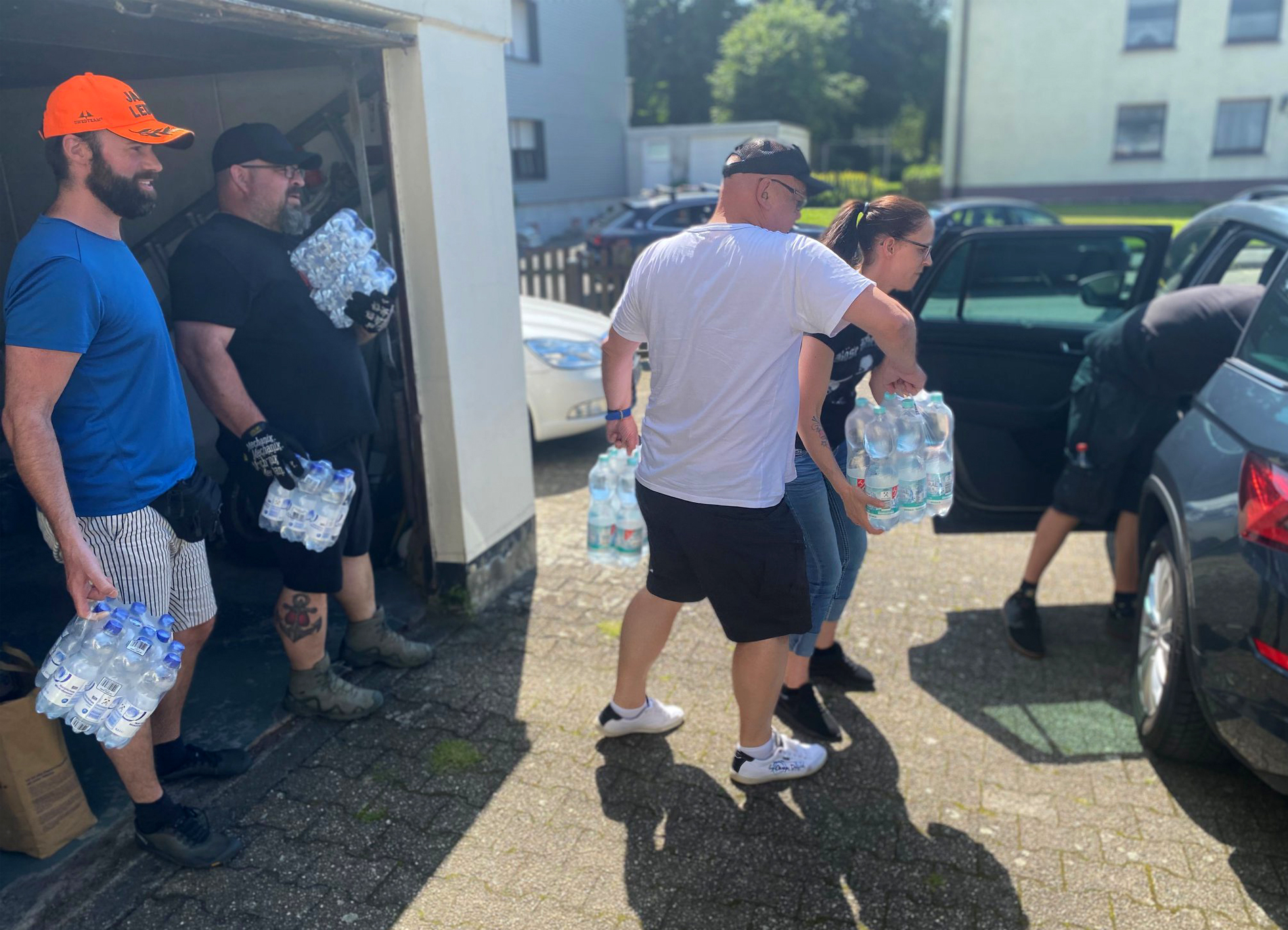 Diese Art Hilfe wurde sicherlich noch gebraucht werden, doch akut ging es um schweres Gerät, Lebensmittel und natürlich – Geld! Nach Rücksprache mit unserem Schwesterverein, der Reservistenkameradschaft aus Aachen, hatten wir mit einer Vorbereitungszeit von gerade einmal 15 Stunden rund 1,5 Tonnen Wasser, Konserven, Kaffee und weiteres gesammelt und mit einem Konvoi aus 7 Autos nach Aachen gefahren. Mitglieder, Freunde und Bekannte, die so kurzfristig keine Zeit hatten, spendeten spontan jeder was er konnte. So konnten wir nicht nur Lebensmittel in das Katastrophengebiet bringen, sondern auch noch finanziell unterstützen.
